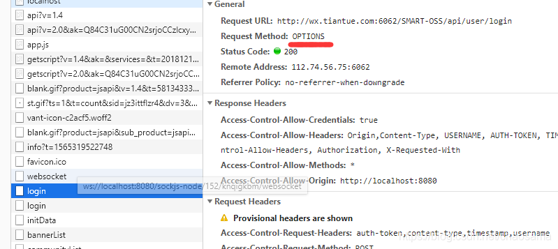 为毛呢,这个就得先从啥是“非简单请求”开始说起,其实就是header里边带了自定义数据后,浏览器会默认你这个请求为“非简单请求”,会向后端先行发送一个“options”类型的请求,只有这个请求被通过了,跨域问题就解决了。(顺带说一下,application/json也会触发这个玩意,所以跨域嘛,是必须的,基础增删查改外类型也会触发)