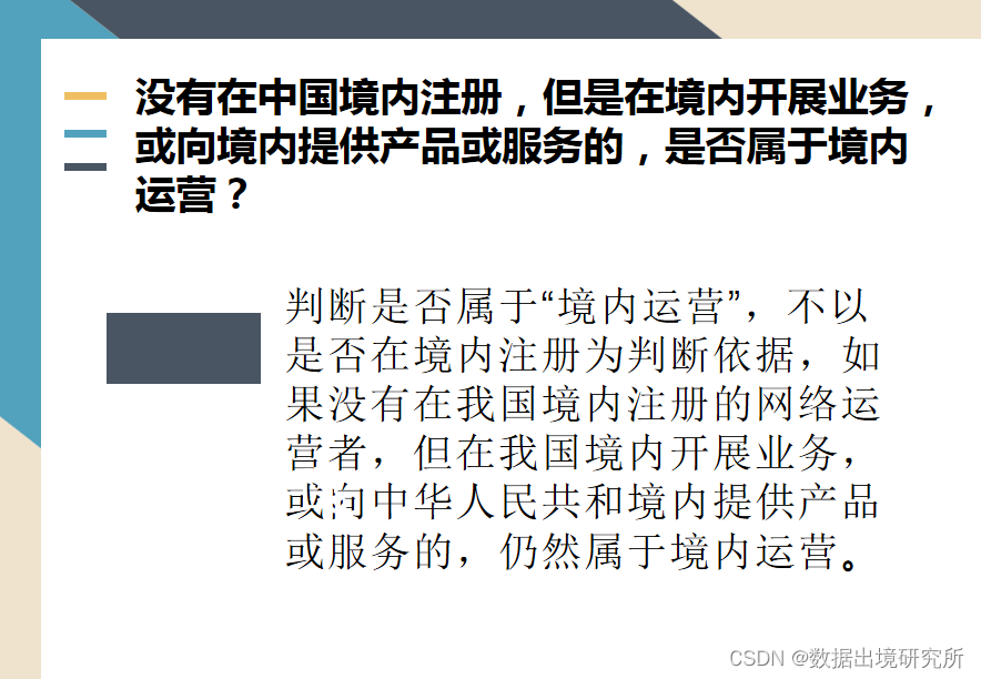 文章指出,判定网络运营者是否属于‘境内运营’不再以其是否在境内注册为唯一标准,重点在于是否在境内开展业务或提供产品或服务。