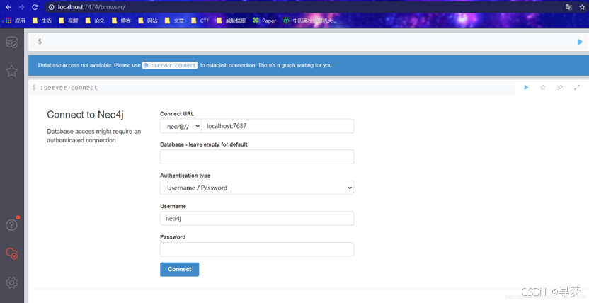 在浏览器中输入界面中给出的网址http://localhost:7474/,则会显示如下界面。