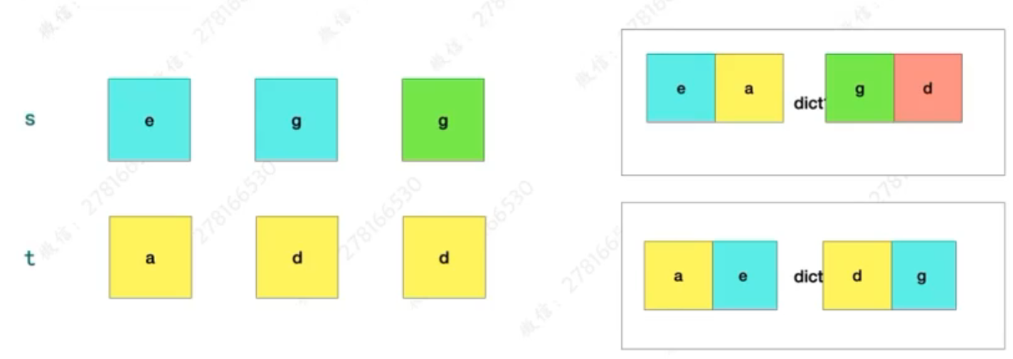 - 法一:设置两个哈希表,key是s的元素值,value是t的元素值,判断每个哈希表中的元素是否配对。