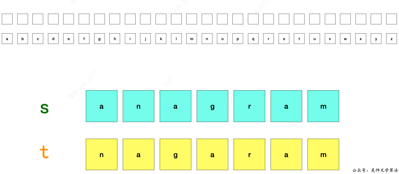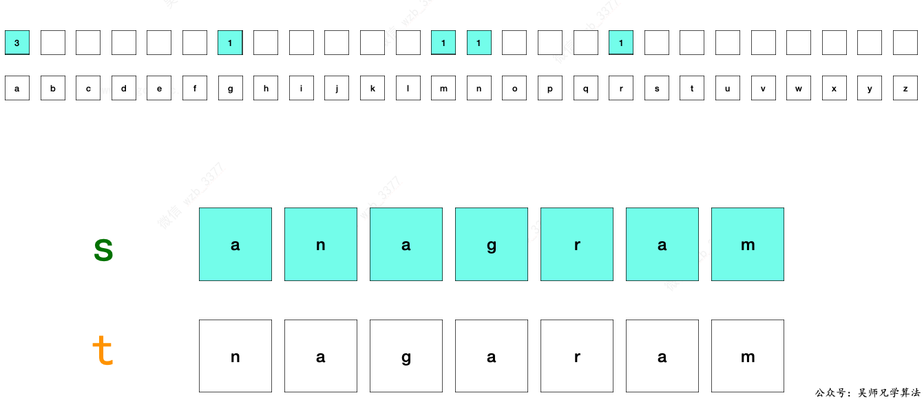 - 3、最后再来统计 t 字符串,即遍历 t 时将对应的字母频次进行减少,如果期间 计数器 出现小于零的情况,则说明 t 中包含一个不存在于 s 中的字母,直接返回 false。