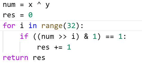 - 先异或得到不同位,然后将结果右移0到32位后与1进行相与操作,如果为1则让计数+=1即可