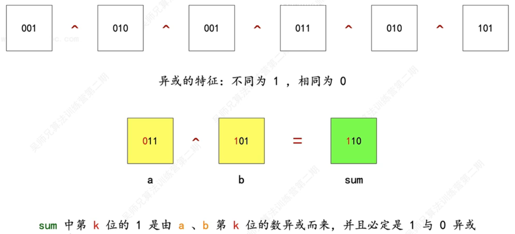 - 也就意味着 sum 上面的 1 必然是由 a 与 b 贡献的,因为两个相同元素的二进制必然相同,异或一下为 0