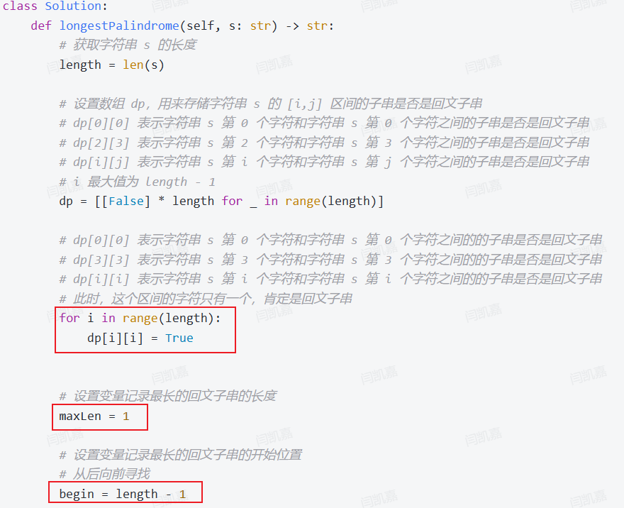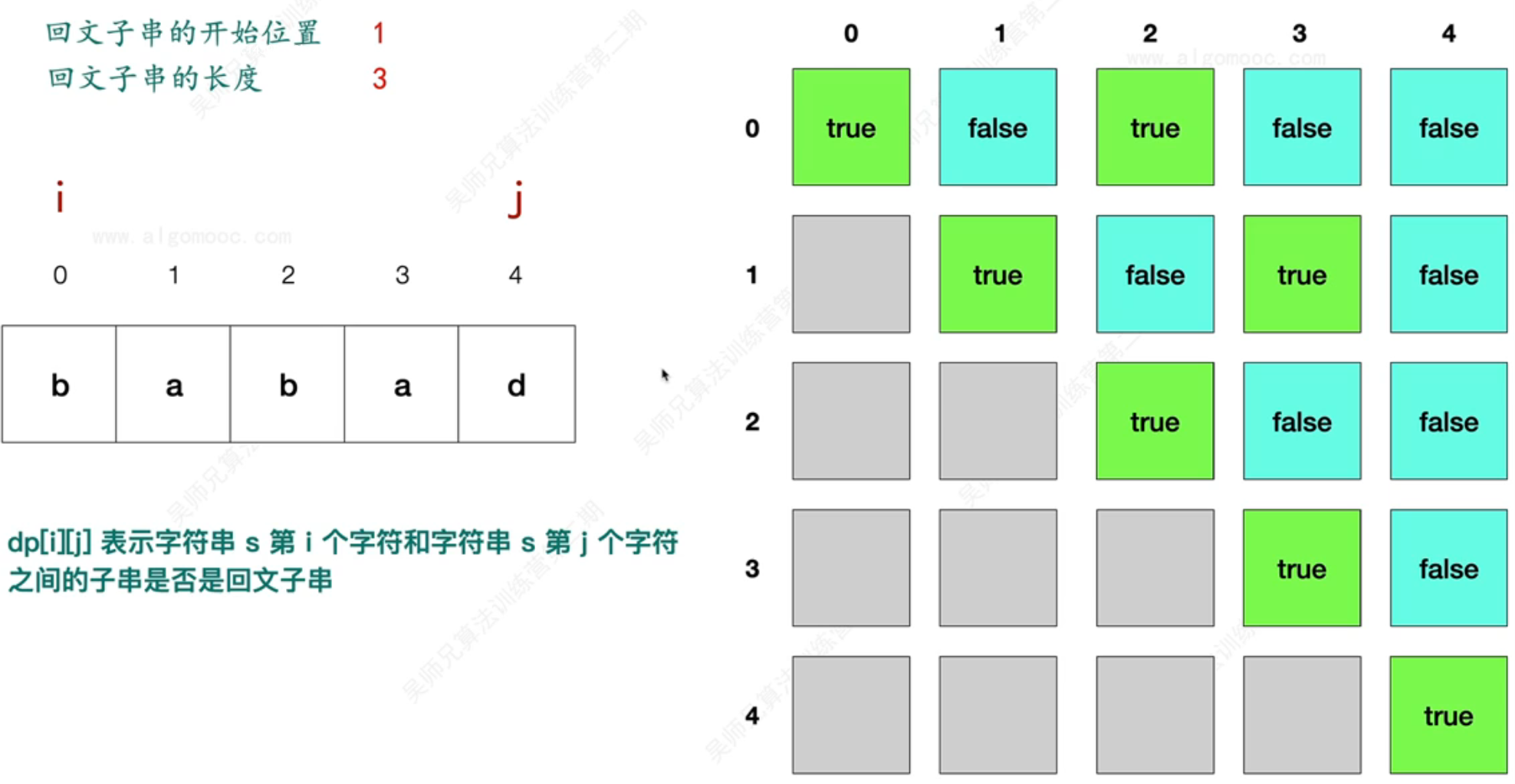 - 因此,dp数组定义为:dp[i][j]表示字符串s第i个字符和字符串s第j个字符之间的子串是否是回文子串