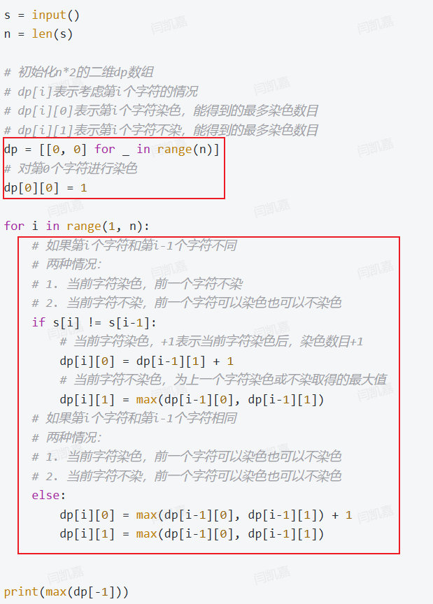 - dp[i][1]表示第i个字符不染,能得到的最多染色数目