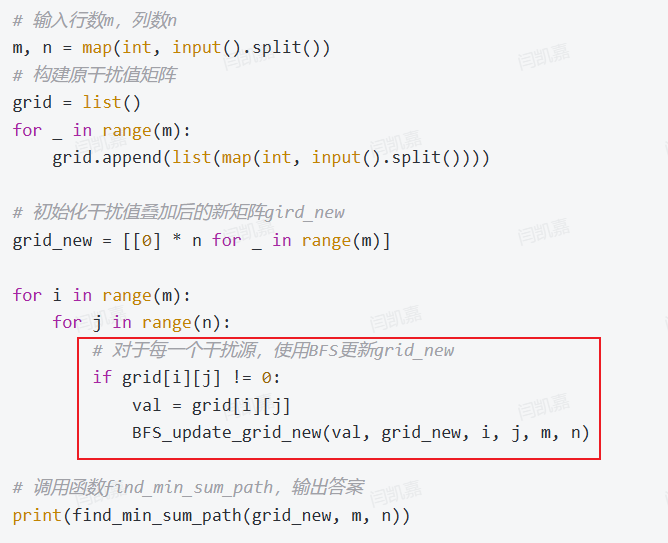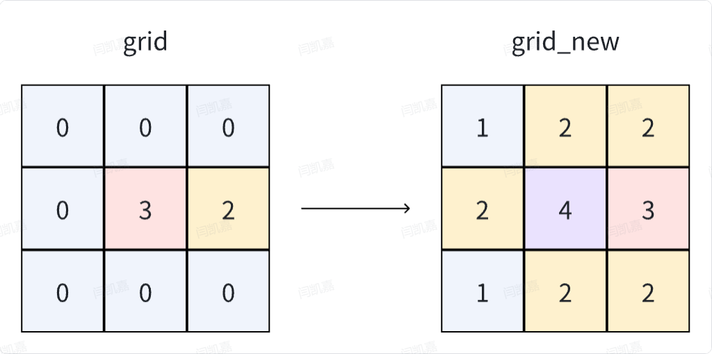 - 首先我们需要根据原矩阵,构建出每一个位置干扰值叠加的结果,得到一个新的矩阵grid_new。这里显然就是一个基于BFS计算层数的问题。