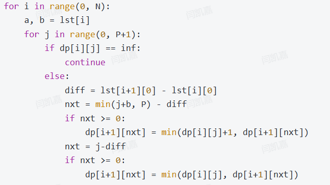 - 注意,上述两个动态转移方程成立的条件是nxt >= 0,即从第i个充电桩开往第i+1个充电桩时,剩余电量不能够耗尽。