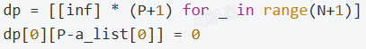 - 在起点出发时,电量为满电,到达第0个充电站时,剩余电量为P-a_list[0],此时最少充电方法数为0次。故初始化dp[0][P-a_list[0]] = 0。对于其他位置,初始化为inf