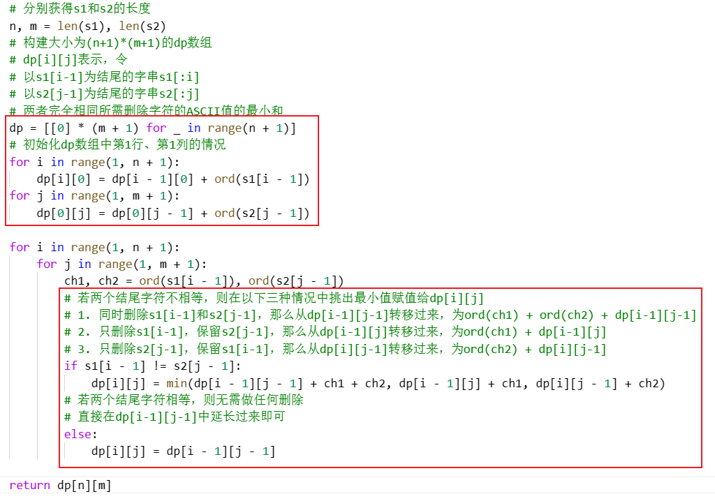 - dp[i][j]表示,令以s1[i-1]为结尾的字串s1[:i] ,以s2[j-1]为结尾的字串s2[:j] ,两者完全相同所需删除字符的ASCII值的最小和