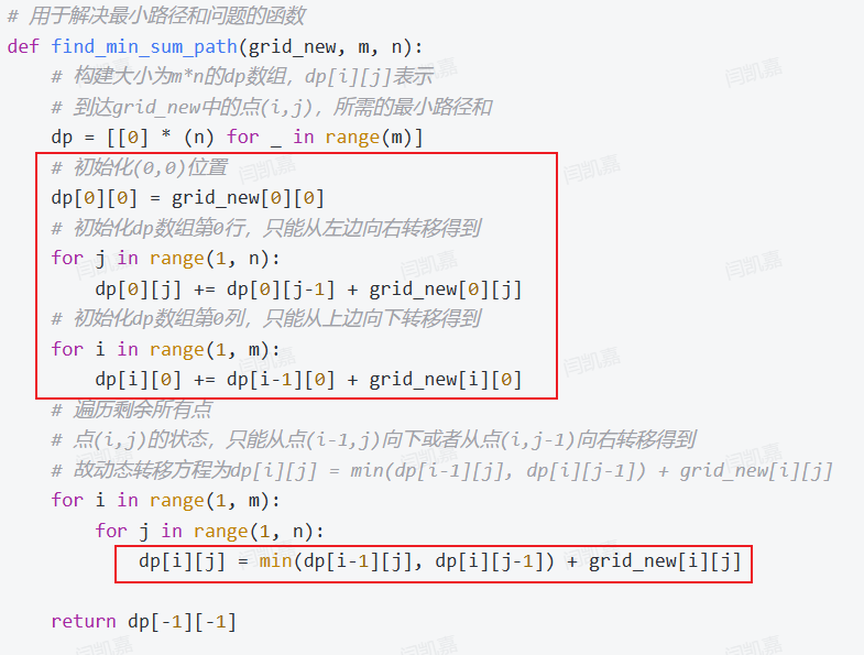 - 在得到新的矩阵grid_new之后,问题就转变为,对grid_new构建一条从左上到右下的路径,每次只能够向右或向下移动,路径经过的点的总和需要最小。这是一个经典的路径DP问题,和LeetCode64、最小路径和完全一致。