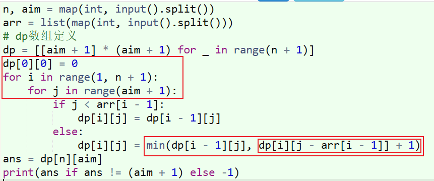 - 具体来说,可以使用两层循环来实现枚举。外层循环枚举钱数i,从1到aim;内层循环枚举面值arr[j],从0到n-1。对于每个钱数i和每个面值arr[j],我们需要判断是否可以用arr[j]来组成钱数i,即判断i是否大于等于arr[j],如果是,则可以用arr[j]来组成钱数i,此时我们需要判断dp[i - arr[j]]是否为正无穷,如果不是,则可以用dp[i - arr[j]] + 1来更新dp[i]的值。最终,dp[aim]的值即为组成aim的最少货币数。
