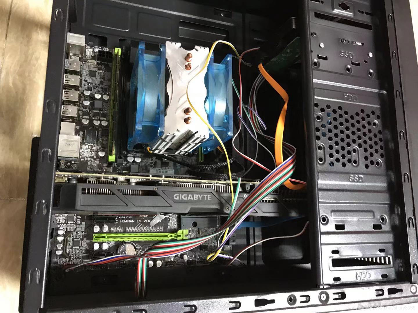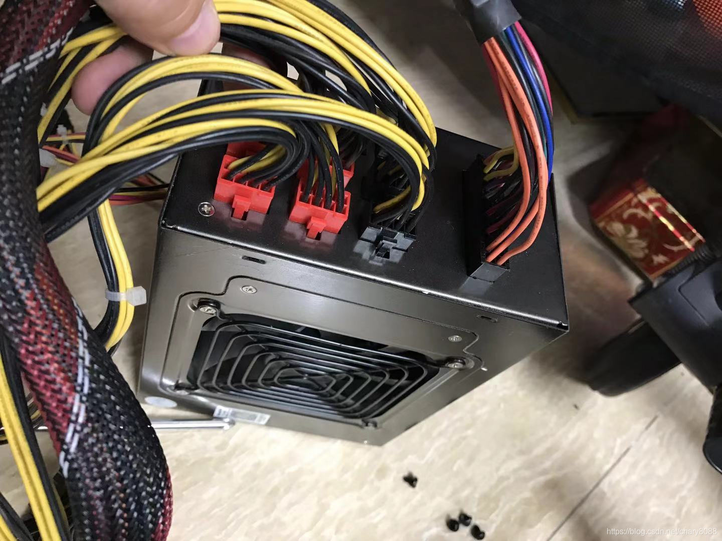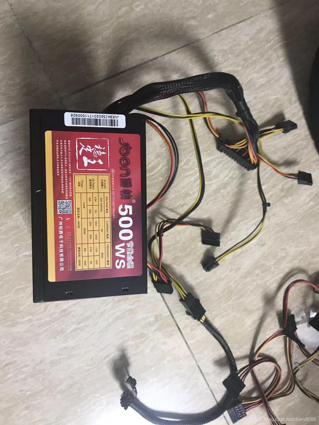 更换前,上图机箱,中间左边矿机电源,右边是矿卡,最下是原来的爵柏电源