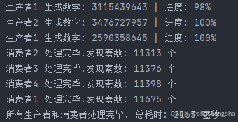 - 主类·:负责启动生产者和消费者线程,记录程序运行时间,并通过特殊“终止信号”通知消费者停止运行。
