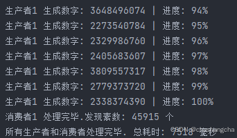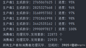 System.out.println("所有生产者和消费者处理完毕. 总耗时: " + (endTime - startTime) + " 毫秒");