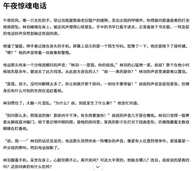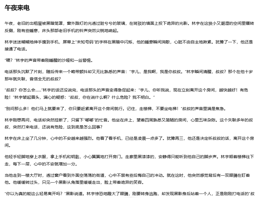 元宝的气质是稳。 我让它写午夜接电话,整体的叙事节奏清晰,但是太平淡看着没意思。而且吊诡的是,元宝和文心一言居然在开篇接电话的部分相差无几,但是从氛围上还是文心一言更胜一筹。
