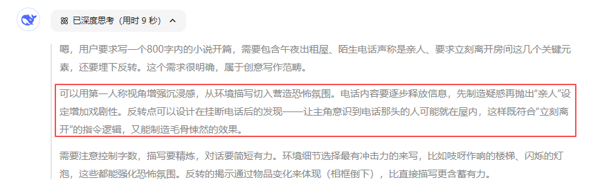 从DeepSeek的思考内容可以看出来,它会认真思考小说写作的逻辑。