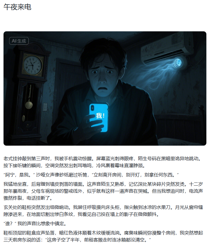 午夜接到未知来电的场景,我让文心一言来写,它会先渲染空气、光线,氛围感强,适合优化心理刻画和细节描写。
