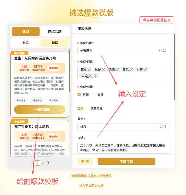 笔灵会先把角色关系搭好,再给你一个故事初稿:像什么人物关系、冲突点、场景推进……这些小说要素全都有。