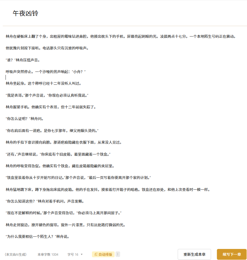 我试着按它的骨架往下写,码字速度明显变快了。还可以点续写下一章,把情节一点点接下去。