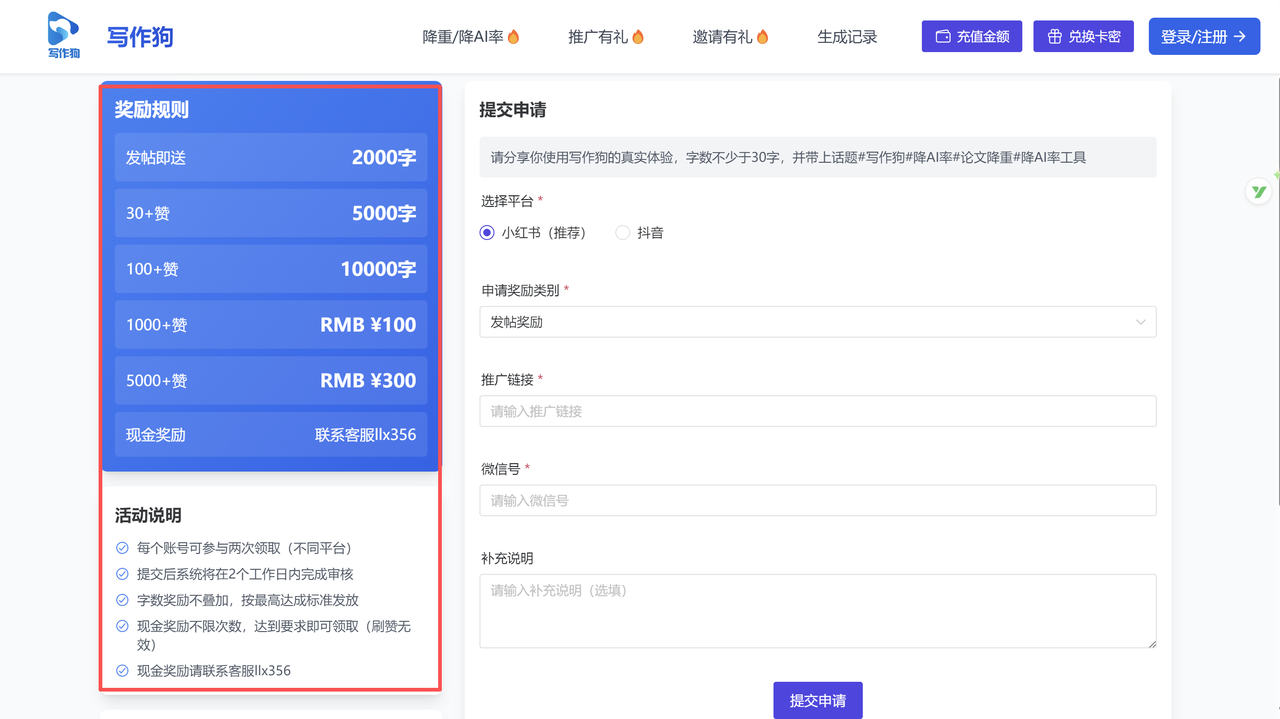 而且我发现现在降AI工具都在搞活动,跟笔灵AI一样,写作狗AI也有推广得免费降的活动,很适合我们这些白嫖党尝试哈哈哈哈哈哈。