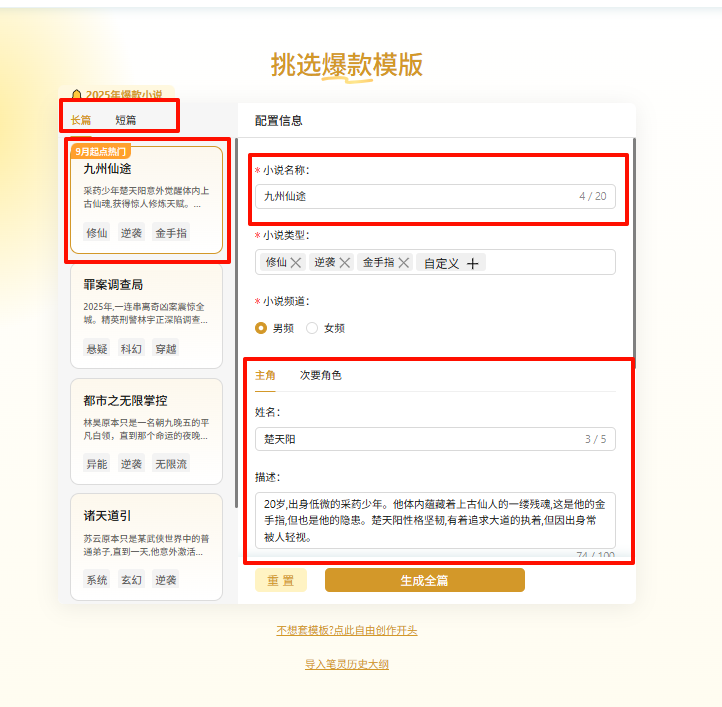 比如你打算写一本修仙逆袭小说,就可以选「九州仙途」这个模板,系统已经帮你把世界观、常见套路、读者喜欢的设定,搭好了基本框架。