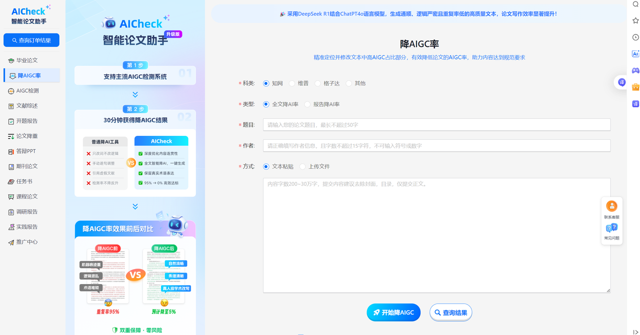 查重与降AI一体化:它不仅可以检测文献中的重复内容,还能根据AI生成的特征进行修改,使文章更加符合人工写作的标准。