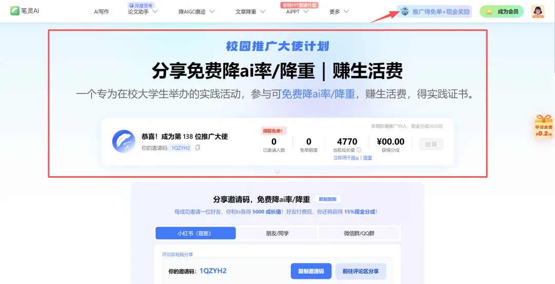 价格也是很让人心动,1000字才3块钱,花小钱办大事是真快乐。前段时间还推出了免费获得降AI/降重的活动,填写邀请码可以获得降AI的成长值,成长值可最高100000!直接抵消付费字数,每成功邀请一位好友,各得 5000 成长值!