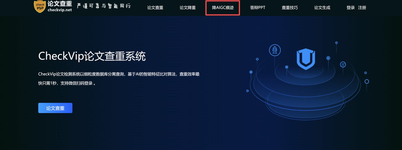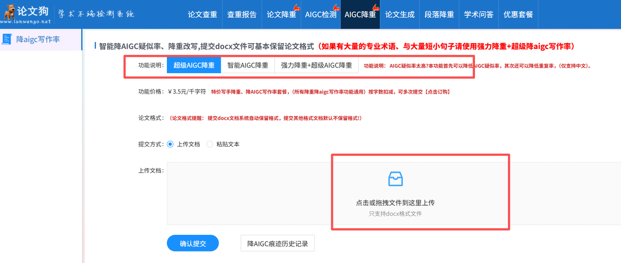 这个其实是个查重平台,但最近推出了强化降AI功能。用的是基于学术语料库的AI检测对抗模型,听起来就很专业。最大优势是服务一体化,查重、降重、降AI都能在一个平台搞定,不用来回切换。如果你用的是主流高校定稿系统,记得要选「强力降重」功能,普通模式效果会差一些。