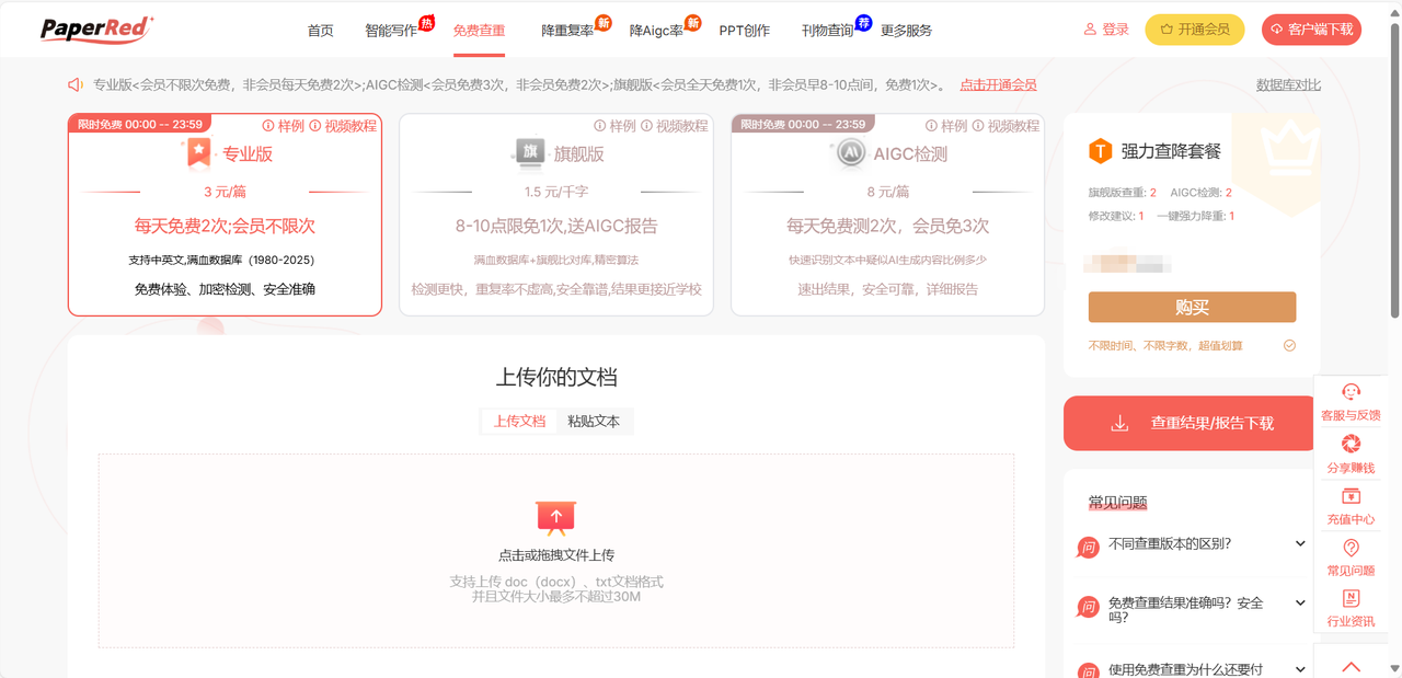 这款是很多学生听说过的,它早期主打“查重+降重”,现在也加了AI检测模块。