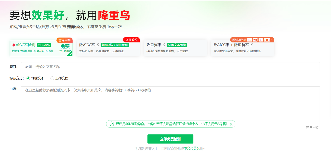 降重鸟是那种“一站式工具箱”型的,有查重、降重、AI检测等功能。