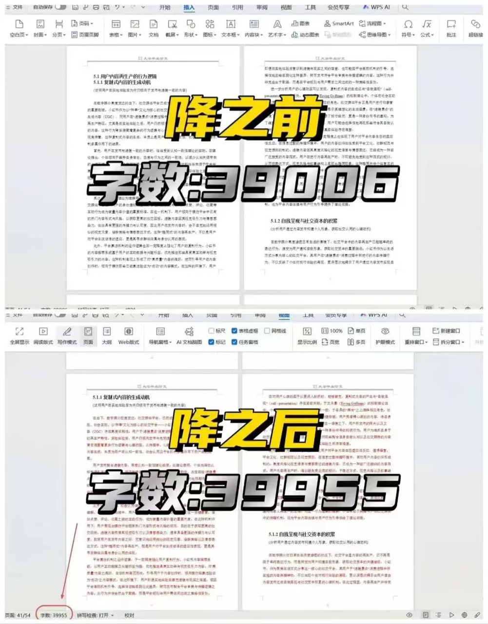 第二,降完字数基本不变。用过别的工具都懂,最怕得就是字数暴增或暴减,格式全乱了。但它就特别稳,你看下面这图的字数对比。