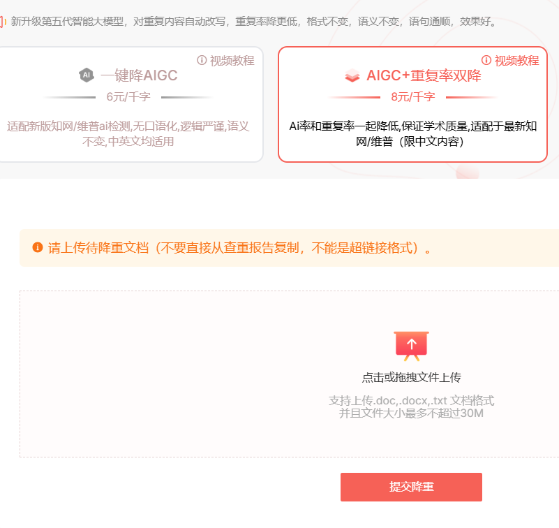 降重鸟采用的"深度语义重构"技术,不是表面替换词汇,而是理解句子的底层含义后重新组织表达。改写出来的文本也更接近人类写作风格,不容易留下机器痕迹。但这个工具最大的问题是价格太贵。单独降AIGC是5元/千字,如果选择"双降"(同时降低AIGC率和降重复率)要8元/千字。字数少可以试试,多了对学生来说确实有点肉疼