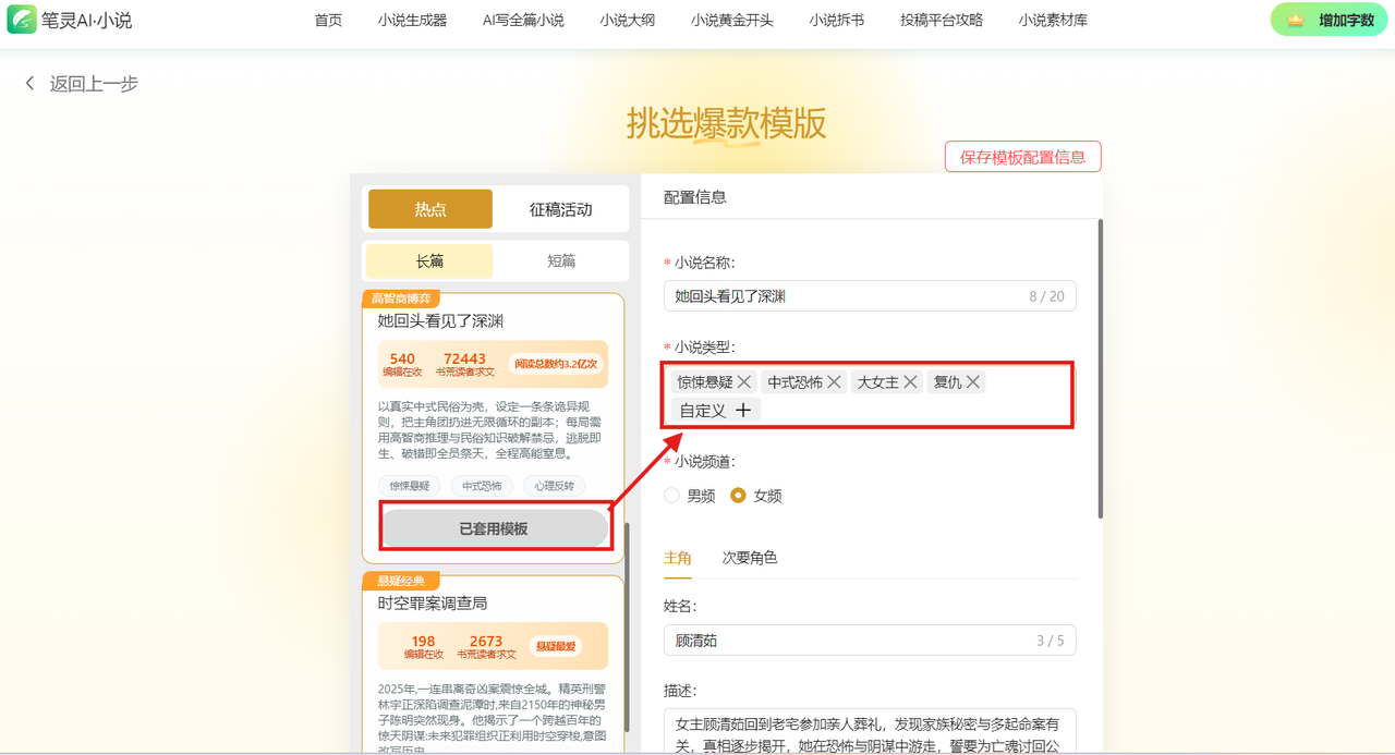 它内置了N种热门的“长短篇模板”,比如“知乎盐选爽文”、“番茄逆袭文”、“晋江XX文”的框架。