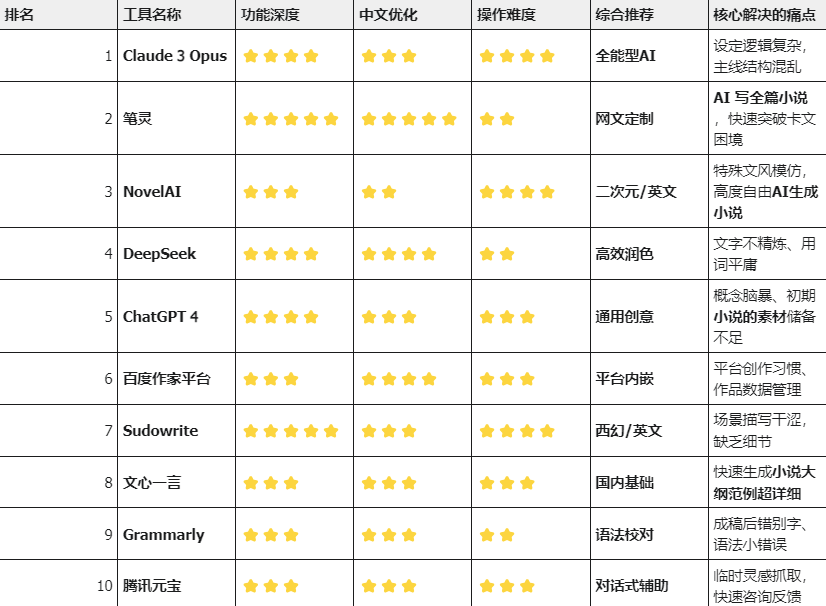 这次评分(满分 5 星)主要看三点:功能深度(对专业写作的支持)、中文优化(能不能理解咱们网文的梗和语境)和操作难度。