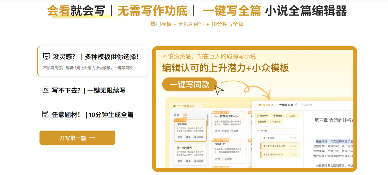 说实话,写小说的最怕什么?不是写得慢,而是写着写着不知道下一章该接什么。笔灵最让我惊喜的就是它的 AI写全篇小说 功能。