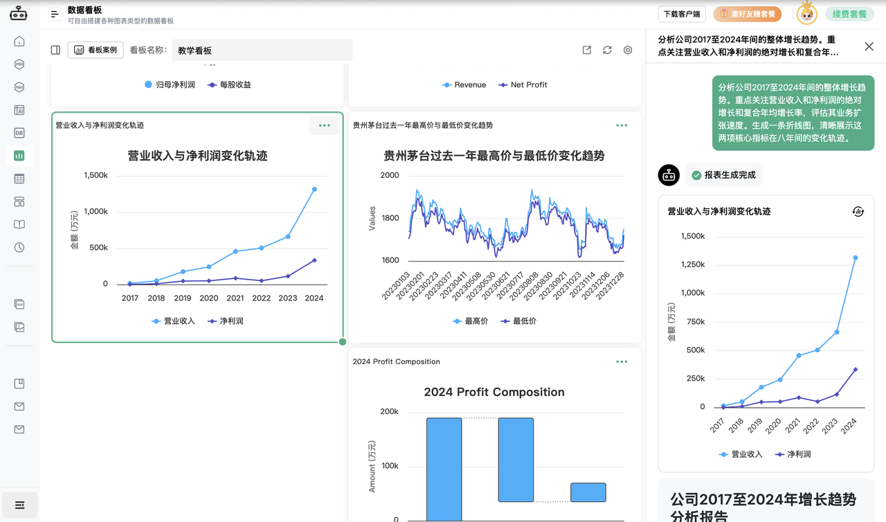 不仅如此,ChatExcel 的强大之处在于,它可以根据你的需求自动进行数据分析、生成图表,甚至是制作精美的 PPT 和数据看板,完全不需要任何 Excel 函数或复杂操作。你只需要专注于“分析结果”和“决策”,AI 会帮你搞定数据处理和报告生成。