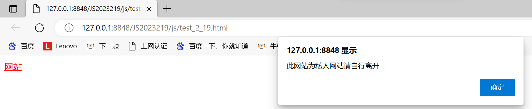 行内式我们理解为直接在一行内进行编写,例如我点击一个名为"网站"的链接打印出一个警告框提示"本站为私人网站请自行离开"。