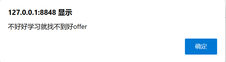 alert语句我们在上面的行内式介绍中已经讲解到了,使用alert与编写代码实现的效果是弹出一个警告框,例如弹出一个"不好好学习就找不到好offer"的警告。