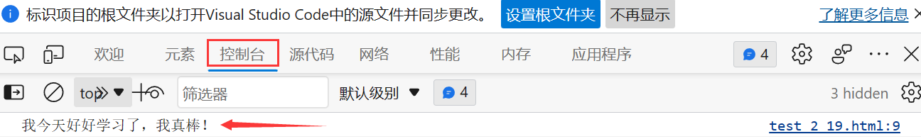 言归正传,例如我要使用console.log()语句在控制台中显示"我今天好好学习了,我真棒!"