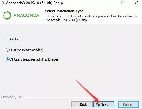 "all users"选项表示将Anaconda安装到计算机上的所有用户都可以使用。这意味着软件和工具集将对每个用户帐户进行安装,需要更长的安装时间和更多的磁盘空间。