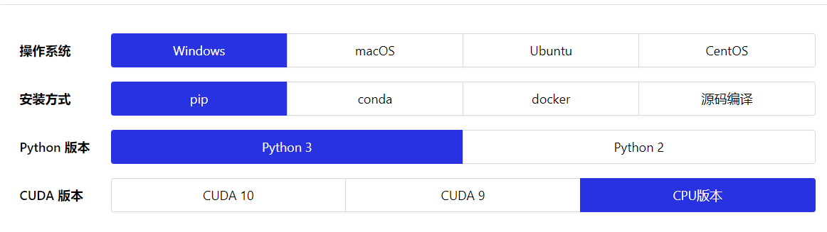 根据你自己的情况选择这些选项,最后一个CUDA版本,由于本实验不需要训练数据,也不需要太大的计算量,所以直接选择CPU版本即可。选择完毕,下方会出现安装指引,不得不说,Paddlepaddle这些方面做的还是比较贴心的(就是名字起的不好)。
