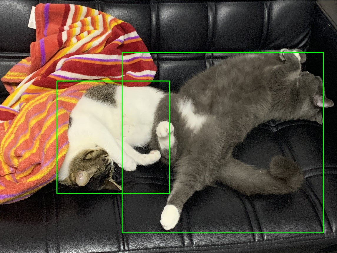 可以看到,识别到了两只猫,其中第一只猫顶部位置为961,右部位置为2024,左部位置为684,底部位置为2299。根据这个位置,可以用框框标记出两只猫: