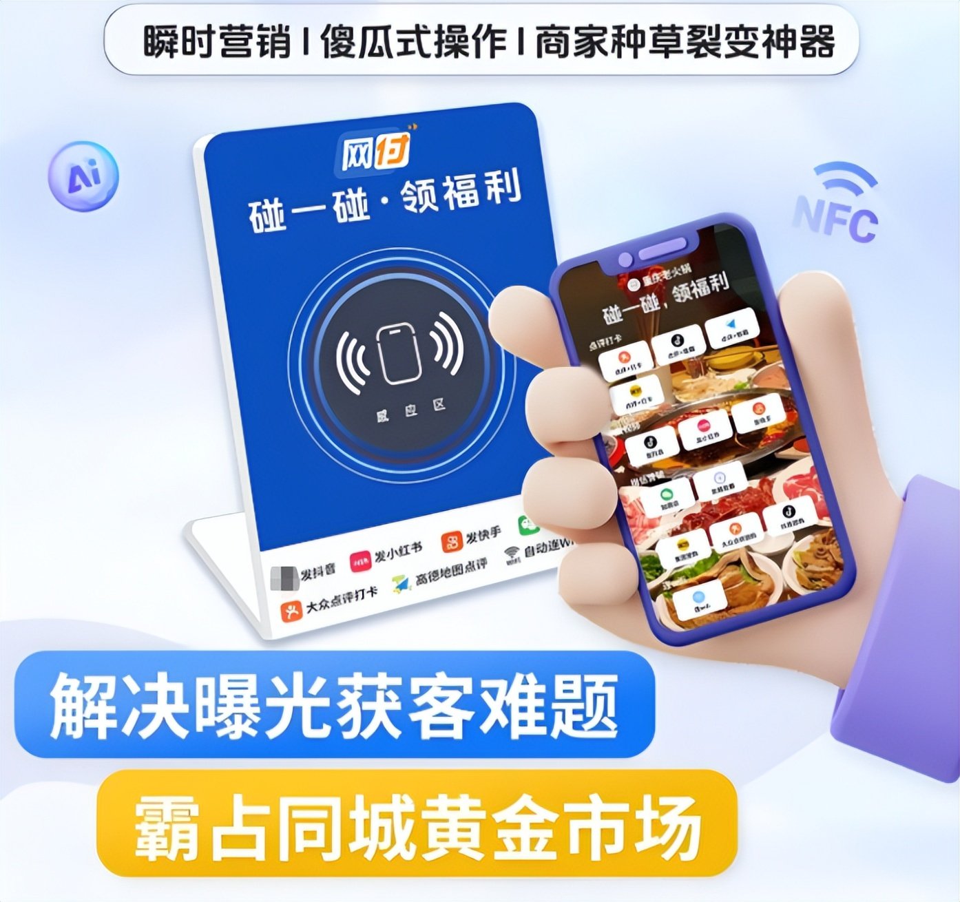 你只需要将其铺设至商家店内,后期,顾客到店消费时,就可以通过用手机碰一碰相应的NFC标签,来帮商家在各大平台获得更多的自然流和新订单。