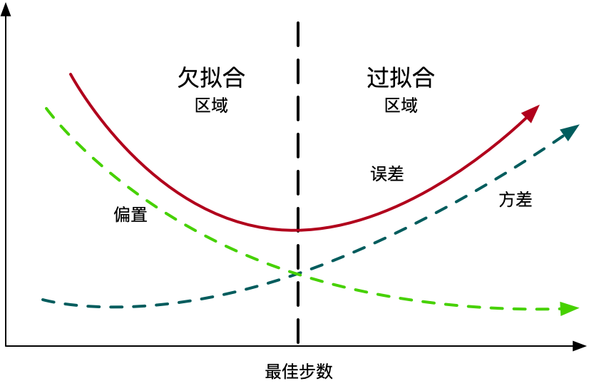 如果继续训练足够的epoch,过了最佳步数区域,则到了过拟合区域,可以看到bias很小,但是模型的方差(Variance)会变大,泛化(generalization)误差也会变大。
