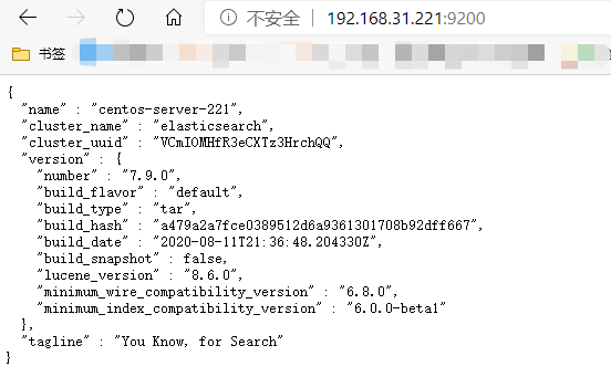若是启动成功,可在局域网内任何机器访问,默认端口是9200,我的服务器ip是192.168.31.221,所以访问地址为:http://192.168.31.221:9200 ,成功访问后,出现以下界面: