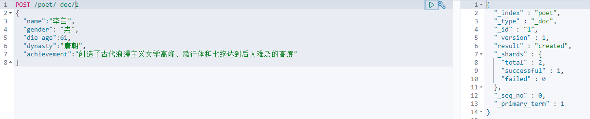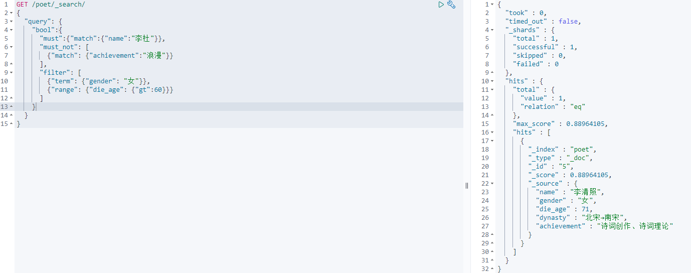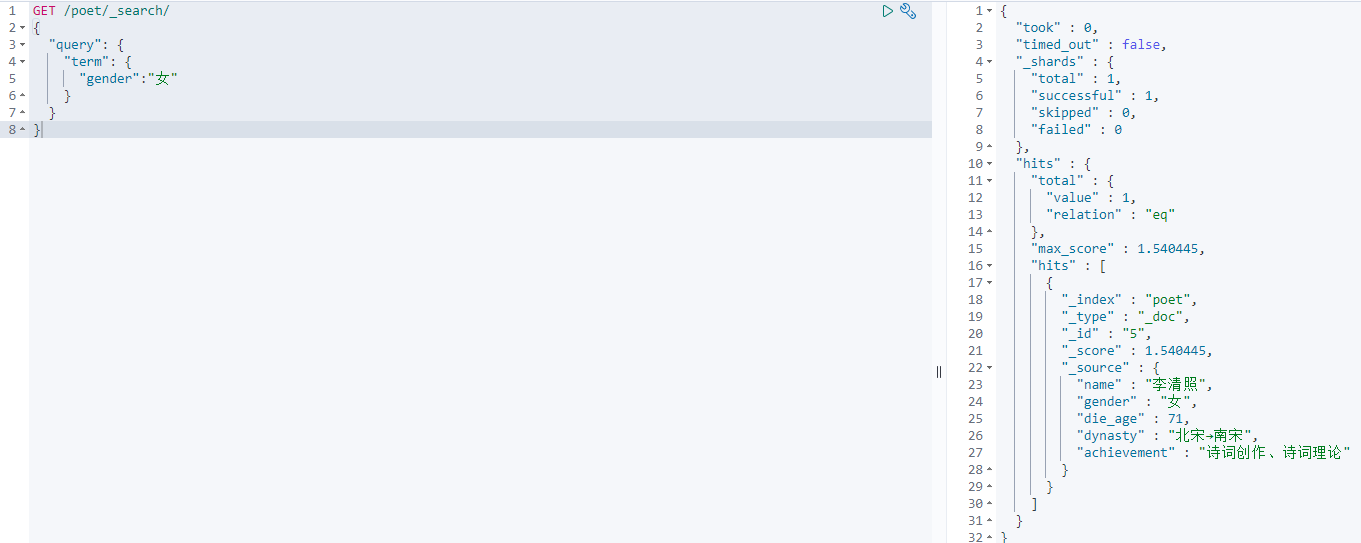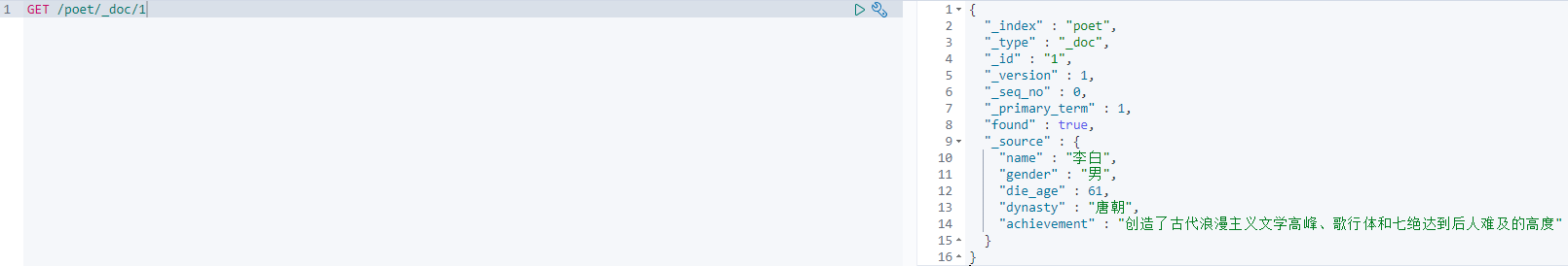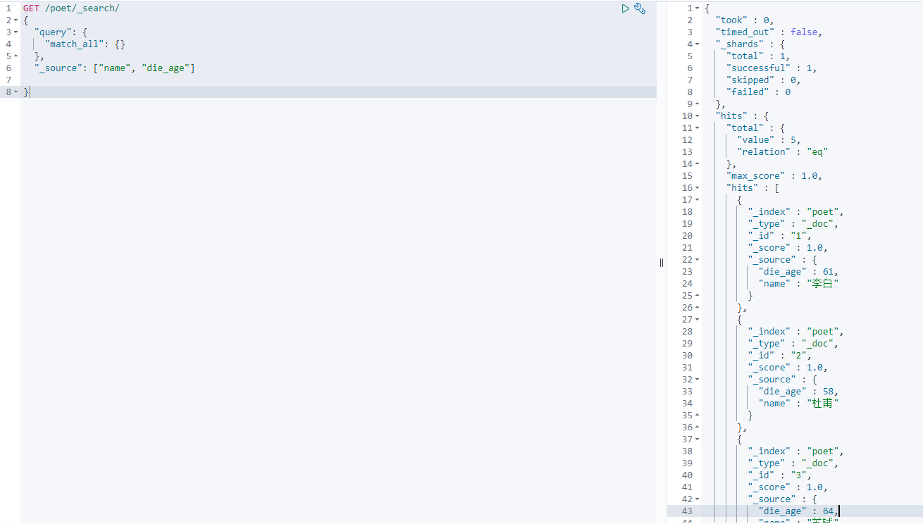 如下所示,查询出索引poet中所有的文档(截图并未显示全部):