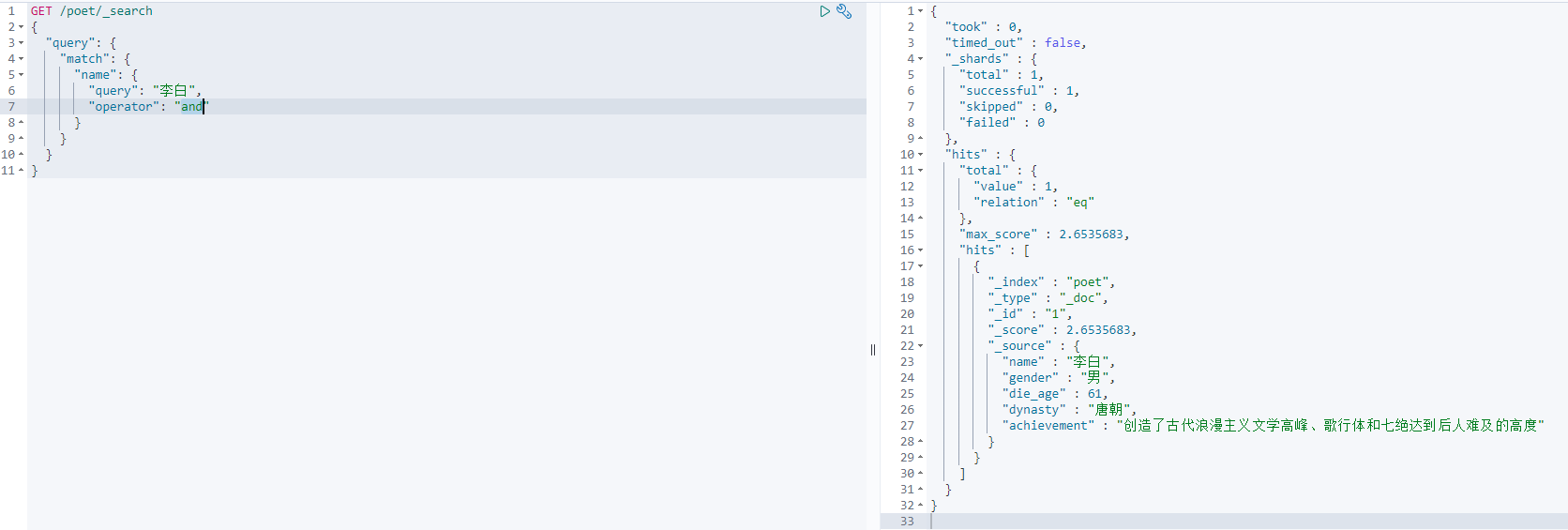 使用match关键字进行匹配查询,如果所匹配的字段是text类型,那么,那么,ES会对查询字符串进行分成多个词条,如果查询时设置operator值为or表示多个词条是“或”的关系,如果operator值为and,那么多个词条间就必须是“且”的关系。