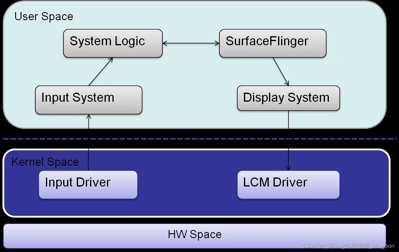 * User Space 的System Server 中的Input System 则持续监听Kernel 传递上来的原始InputEvent, 对其进行进一步的处理后, 变成上层APP 可直接处理的Input Event, 如button 点击, 长按, 滑动等等.