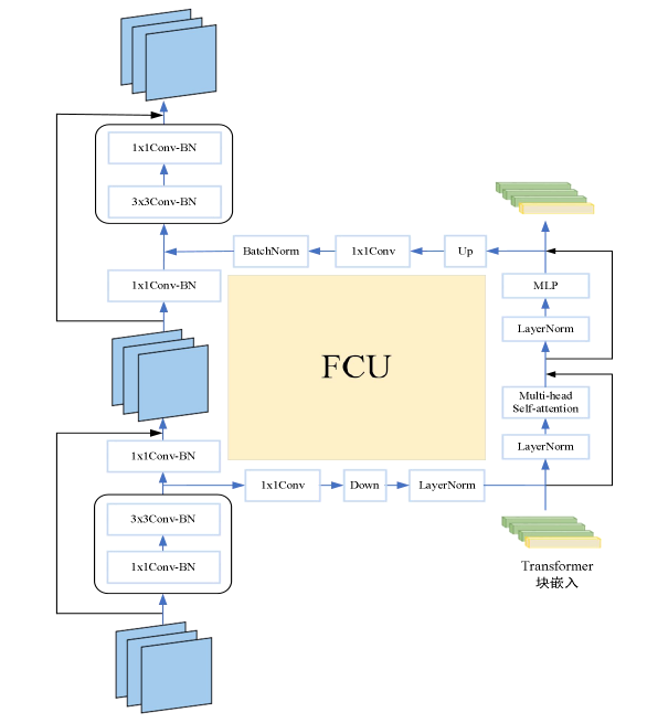 Transformer分支:Transformer分支包括多个Transformer模块,每个模块包含一个多头自注意力机制和一个多层感知机(MLP)。通过多头自注意力,模型可以捕获图像的全局依赖关系。