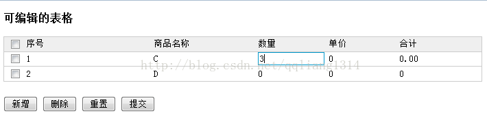 点击增加行,在table的末尾增加一行;点击删除行,删除table中最末尾的一行。
